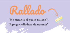 🧀 “Rallado”, “ralladura” y todos sus derivados hacen referencia a desmenuzar algo usando un rallador u otro objeto similar. Por ejemplo, podemos rallar el queso, la cáscara de naranja o el pan.