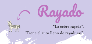 🦓 En cambio, “rayado”, “rayadura”, etc., hacen referencia a las rayas que se hacen, o el daño que se hace a algo con forma de rayas o incisiones alargadas. Por ejemplo, la cebra o una prenda de ropa puede ser rayada, o la pintura del auto puede tener rayaduras/rayones.